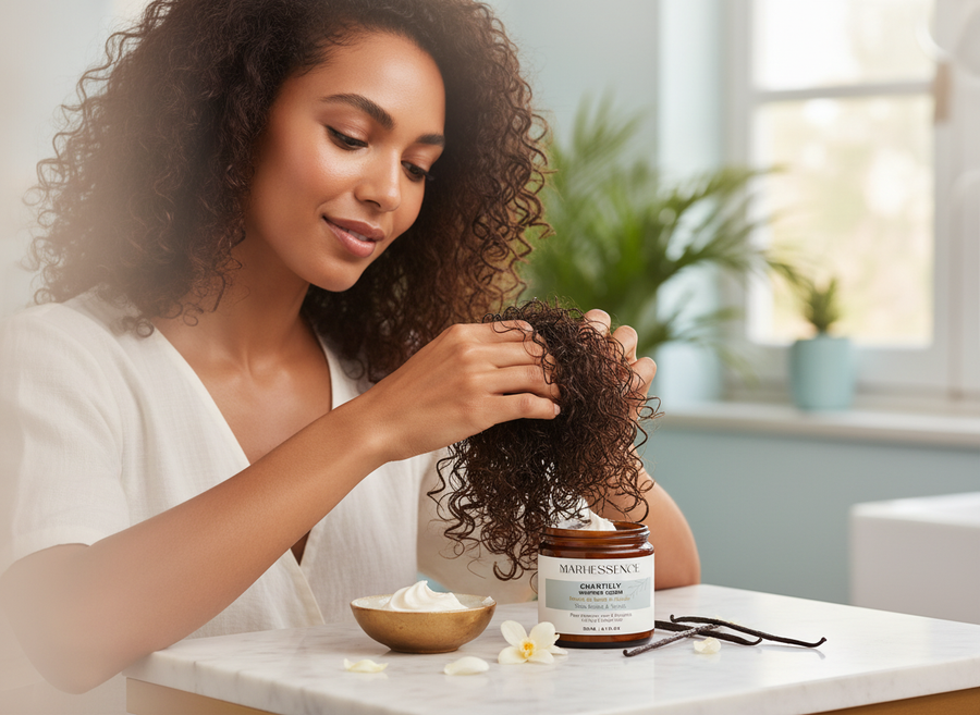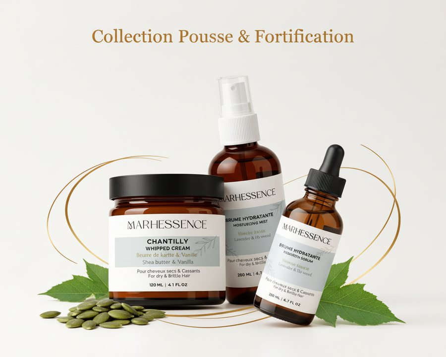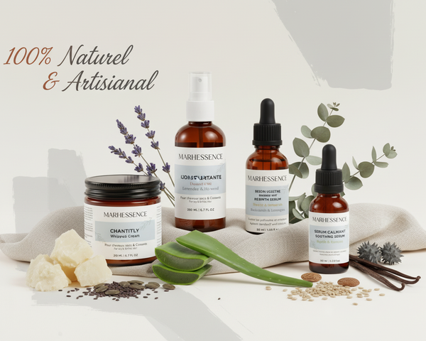 Chaque soin Marhessence est formulé avec des ingrédients naturels puissants pour répondre aux besoins essentiels de vos cheveux. Hydratation, douceur, croissance et confort du cuir chevelu : une routine complÚte, simple et efficace.